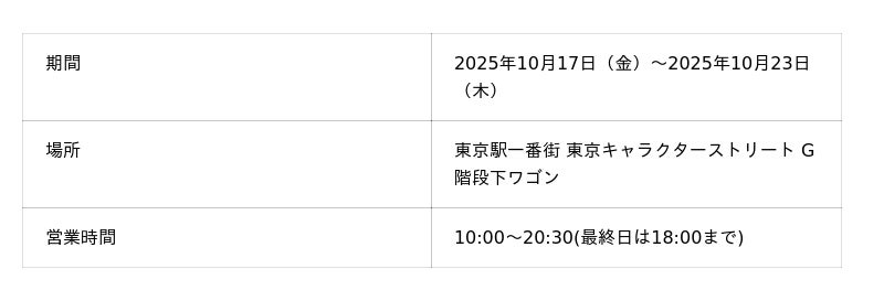 2025/10/17(金)~2025/10/23(木) 東京駅一番街東京キャラクターストリート G階段下ワゴン