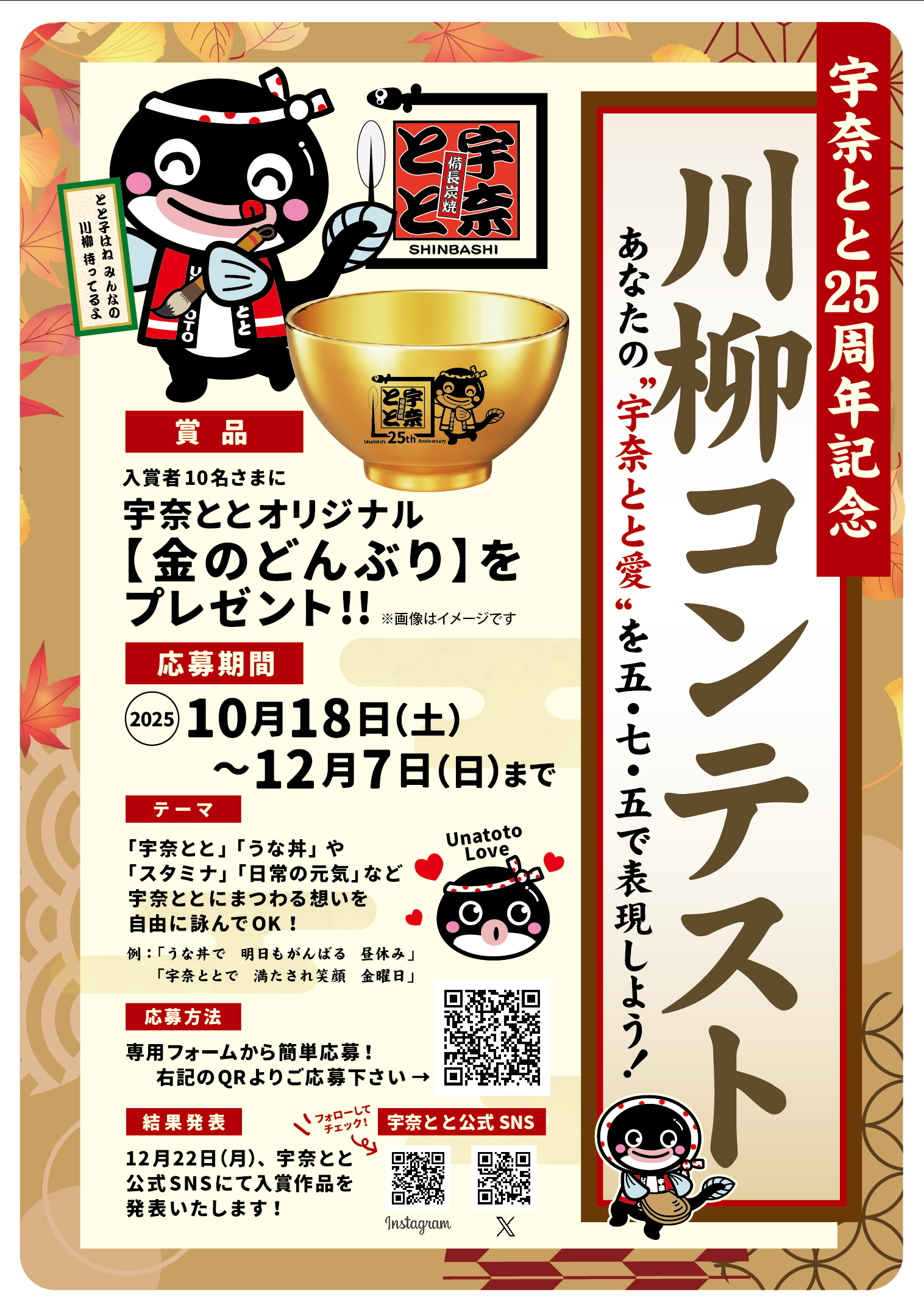 「うな丼」「日常の元気」など、宇奈ととにまつわる自由なテーマで川柳を募集します。