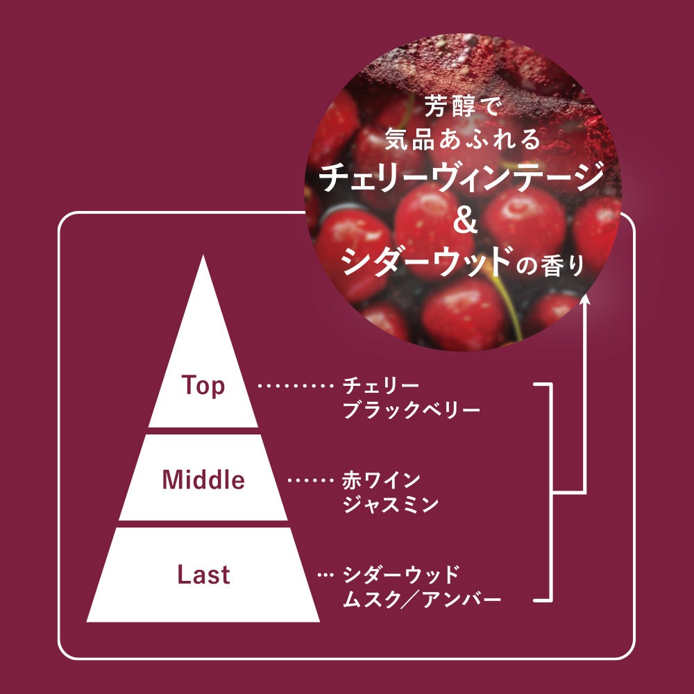 1.【数量限定】「チェリーヴィンテージ&シダーウッド」の香りフルーティーなチェリーやブラックベリーに、深みのある赤ワインが合わさり、シダーウッドとムスクが柔らかく残る、芳醇で気品あふれる至福の香り。深い余韻に包まれ、ゆっくり味わいたくなる香りはホリデーシーズンをよりいっそう彩ります。