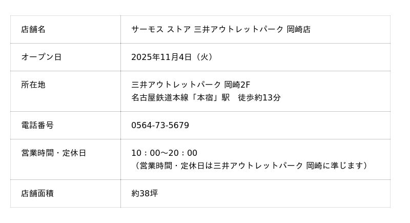 魔法びんのグローバル企業として、人と社会に快適で環境にもやさしいライフスタイルを提案するサーモス株式会社(本社:東京都港区 社長:片岡 有二)は、2025年11月4日(火)にサーモスの直営店『サーモス ストア 三井アウトレットパーク 岡崎店』を、三井アウトレットパーク 岡崎にグランドオープンします。