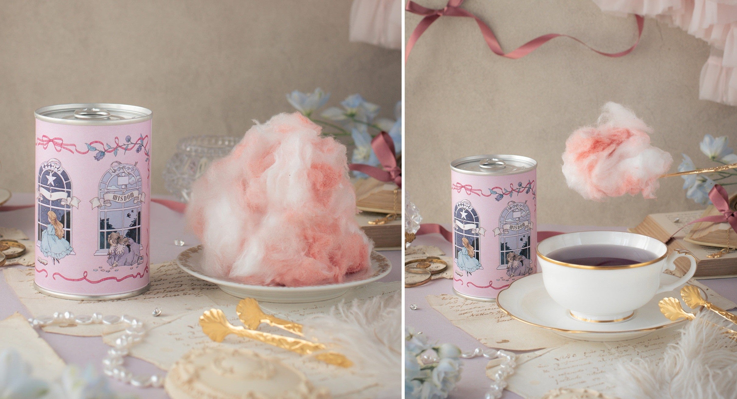空想をテーマにした謎解きイラスト缶の中には、甘くてふわふわ、まるで夢を見ているようなコットンキャンディ(綿菓子)が。きゅんと甘酸っぱいドライストロベリー風味のコットンキャンディは、そのまま食べても、紅茶などに入れてアレンジしても楽しめます。自分へのご褒美にも、謎解き好きの方へのプレゼントにもぴったり。