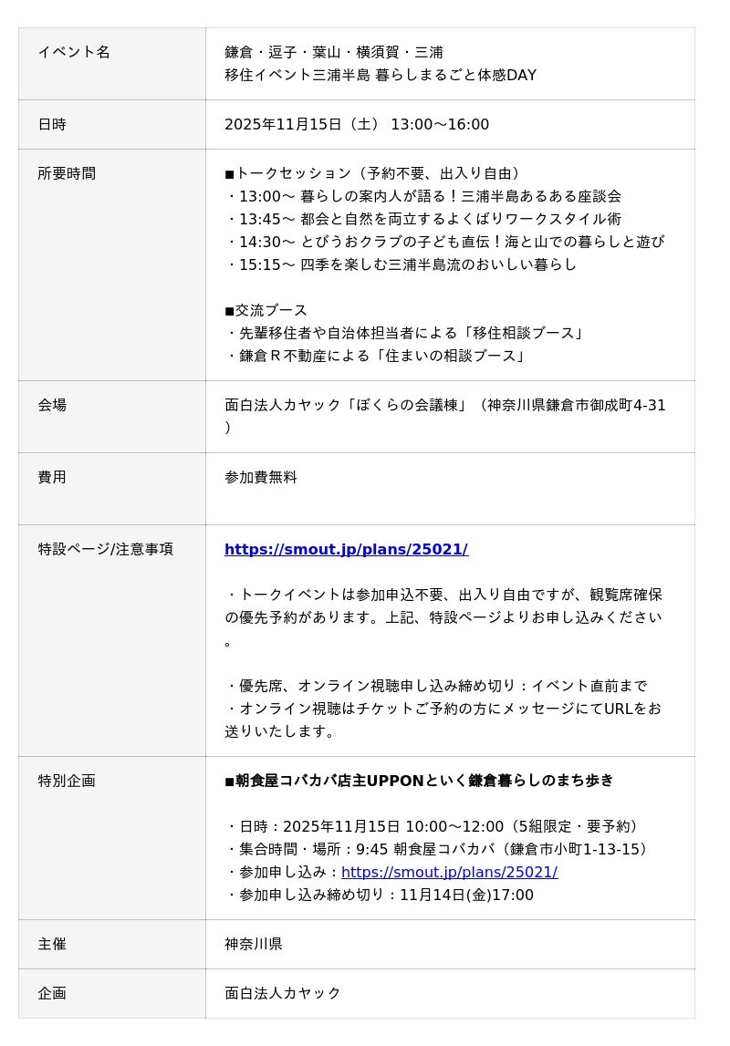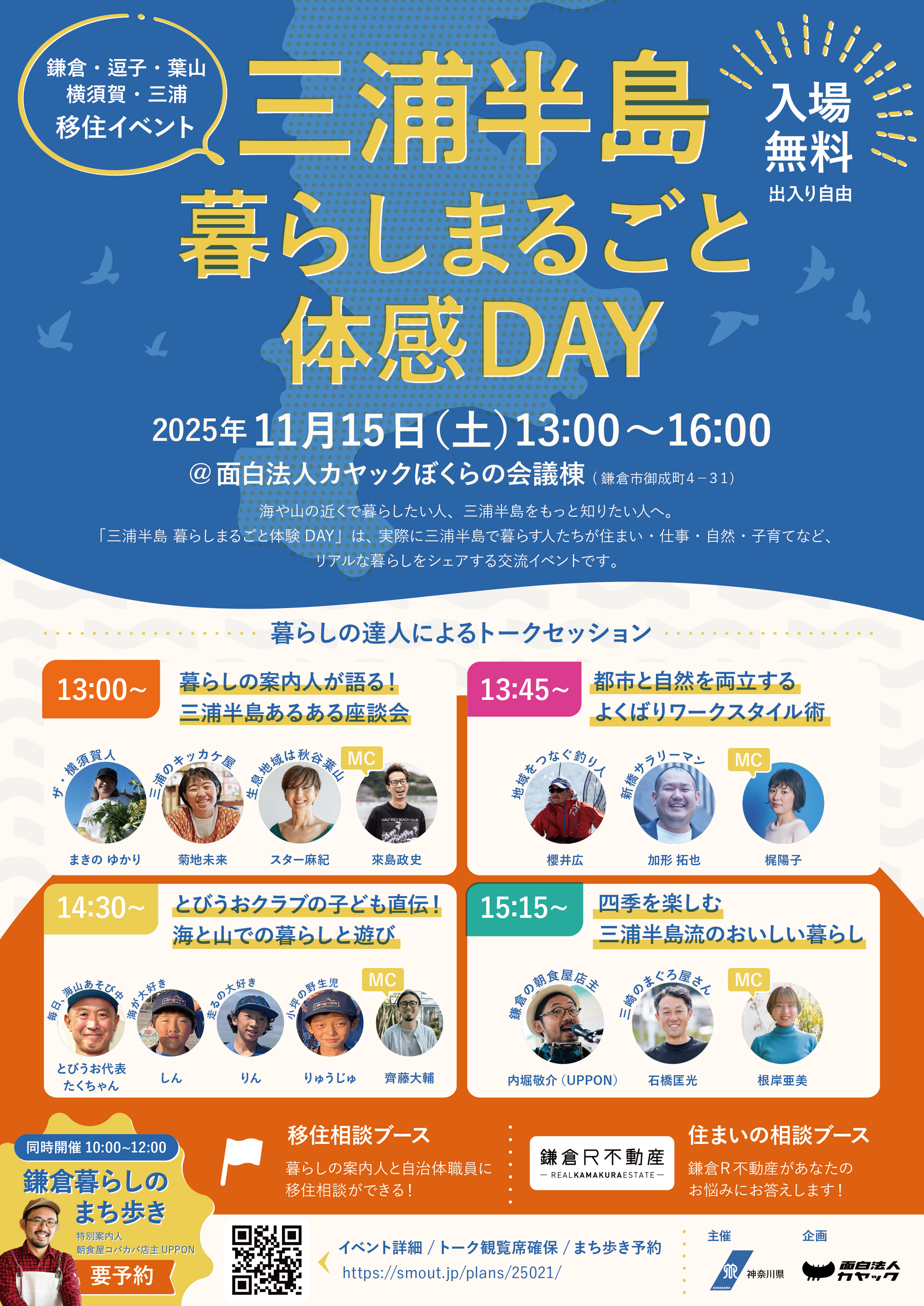 株式会社カヤック(本社:神奈川県鎌倉市、代表取締役CEO:柳澤大輔、東証グロース:3904、以下「カヤック」)は、神奈川県が実施する「三浦半島移住コンシェルジュ」事業(※1)の一環として、初のリアル交流イベント「三浦半島 暮らしまるごと体感DAY」を2025年11月15日(土)に開催します。会場は、JR鎌倉駅から徒歩4分のカヤックの社屋「ぼくらの会議棟」(鎌倉市御成町4-31)です。