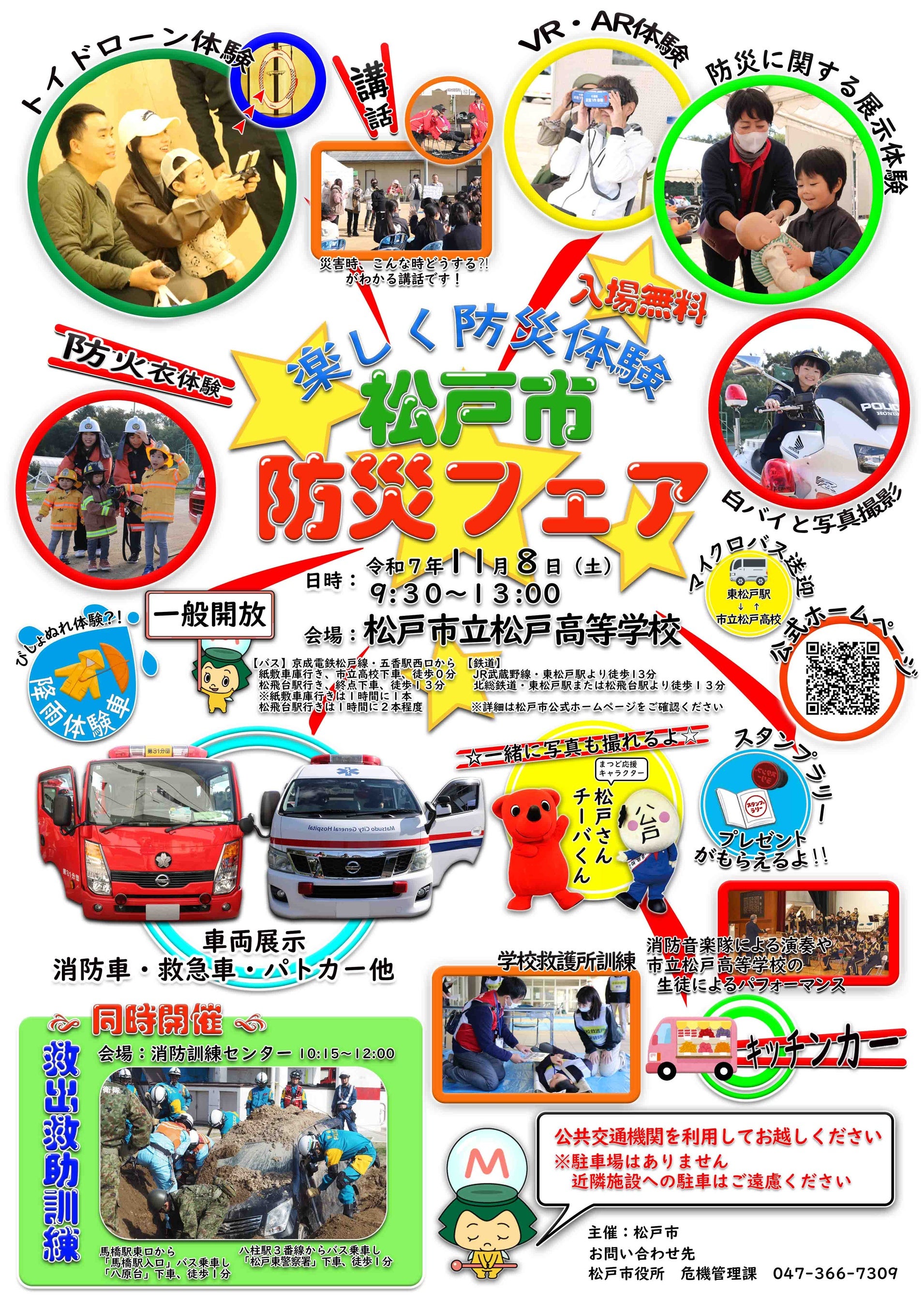 ステージ演目(松戸市消防局音楽隊、市立松戸高等学校モダンダンス部)、協定団体の出展、防災関係車両の展示、避難所展示、VR・AR体験、トイドローン操縦体験、制服着用体験コーナー、スタンプラリー(景品)、学校救護所訓練体験、キッチンカー出店、チーバくんと写真撮影 等