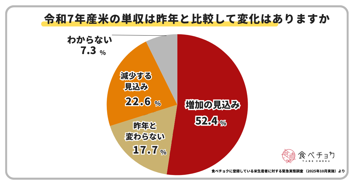 また、単収(栽培面積10aあたりの収量)が増加したと回答したコメ農家は52.4%にのぼり、猛暑が続く中でも多収米の導入や栽培方法の変更などにより生産量を多く確保できていることがわかりました。