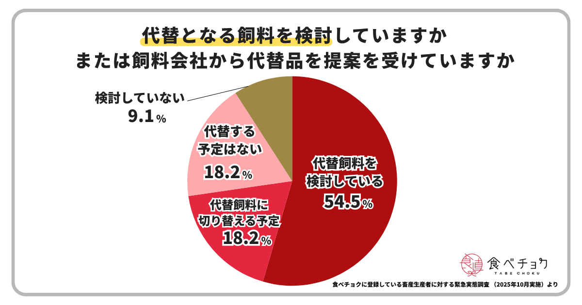 また、「飼料用米から代替飼料に切り替える予定・検討している」と回答した畜産農家は72%を占め、飼料価格の高騰や供給減が畜産経営に大きな影響を及ぼしていることが明らかになりました。