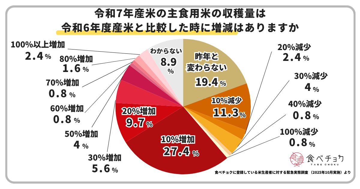 昨年と比較して主食用米の収穫量が増加する見込みと回答するコメ農家は52.3%に上りました。要因としては「栽培面積の拡大」「天候の安定」「水管理や施肥の工夫」などが挙げられました。