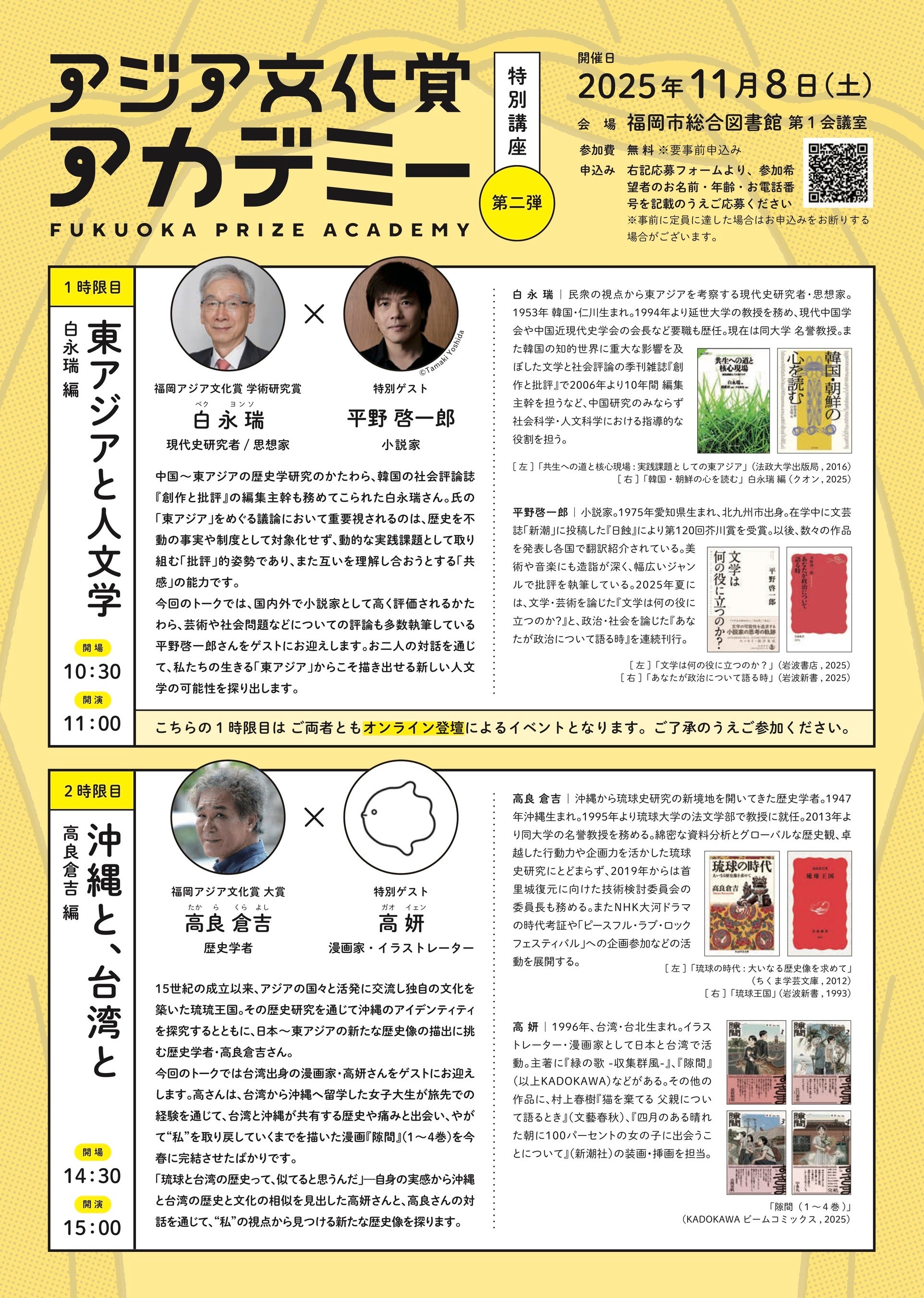 11月8日(土)に福岡市総合図書館で開催される今回の講座では、2025年に大賞を受賞した高良倉吉さんと、学術研究賞を受賞した白永瑞(ペク・ヨンソ)さんが、それぞれ特別ゲストとの対談を行います。特別ゲストとしてお迎えするのはそれぞれ、小説家の平野啓一郎さんと漫画家の高妍(ガオ・イェン)さんのお二人です。参加は無料。ぜひご参加ください。