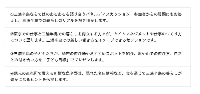三浦半島エリア(以下「三浦半島」という。)の暮らしに興味がある人に向けて、「三浦半島移住コンシェルジュ」(注記2)や先輩移住者が住まい・仕事・自然・子育てなどリアルな暮らしの情報をシェアし、三浦半島の暮らしを楽しく体感することができる移住イベントです。(1)イベント名
