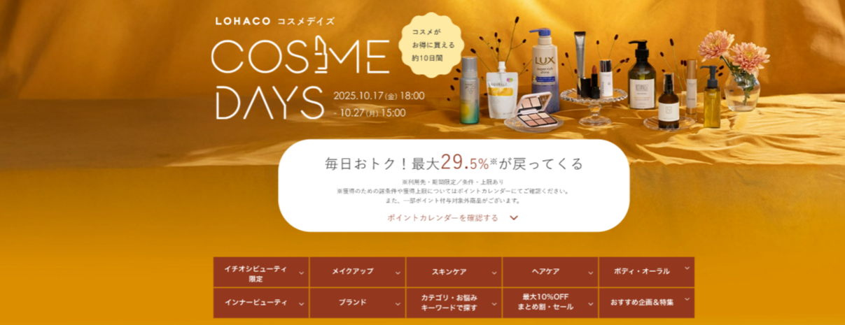 秋の新作コスメ・ヘアケア商品はもちろん、自分へのご褒美にも最適な限定セットや人気の定番品など人気ブランドの商品を多数ご用意。日頃から LOHACO をご利用いただいているお客様はもちろん、初めてご利用のお客様も期間中、最大29.5%(※1)が戻ってくるおトクにお買い物をお楽しみいただける10日間です。