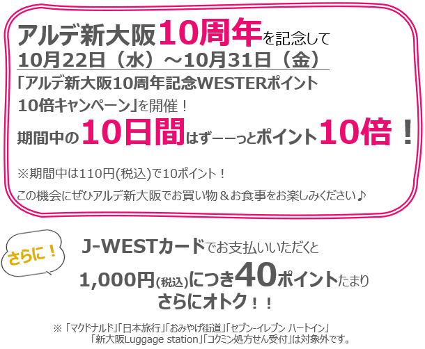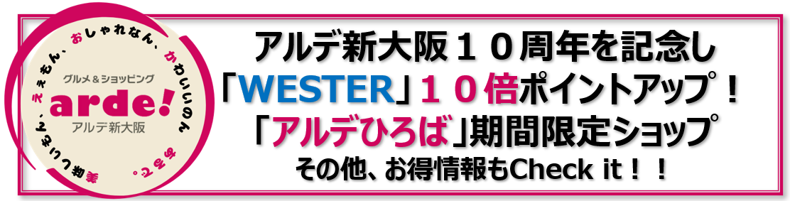 「アルデひろば」「アルデひろばプラス」の期間限定ショップ、WESTERポイント10倍アップなど、お得な情報をお届けします!