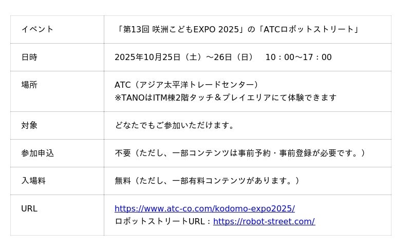 TANOTECH株式会社と豊丸産業株式会社は、2025年10月25日(土)・26日(日)に大阪南港ATCで開催される「第13回 咲洲こどもEXPO 2025」の「ATCロボットストリート」に、ゲーム感覚で楽しむ未来の運動として、あそびながら体を動かせる未来型トレーニングシステム「TANO」の連携ブースを出展します。