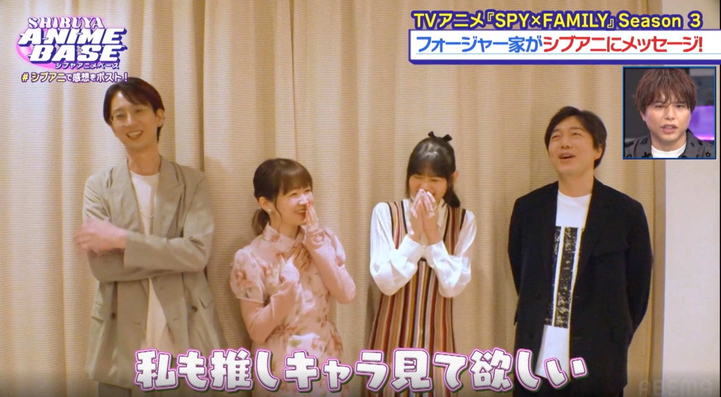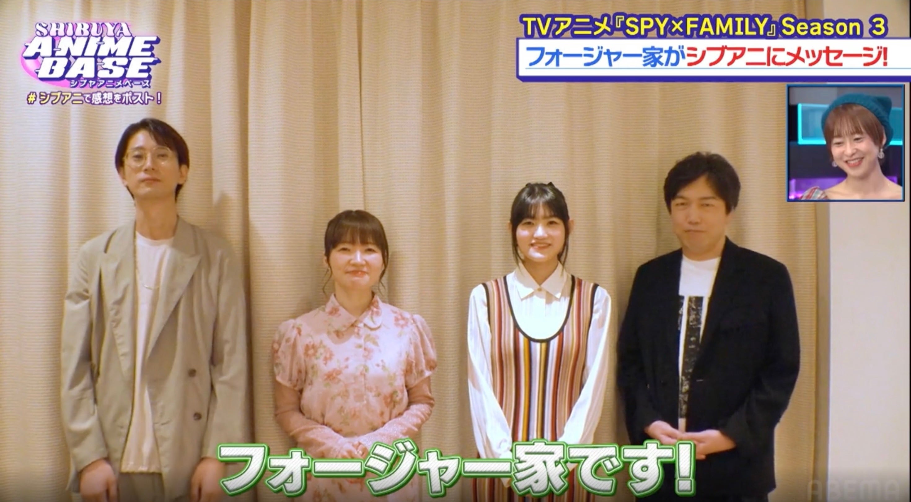 今回の『シブアニ』では、テレビアニメ『SPY×FAMILY』Season3の先行上映会、舞台挨拶に潜入。舞台挨拶にMCとして参加していた天津飯は、本舞台挨拶の裏側について「写真撮影の際、少し外れたところにいたら、種崎敦美さんが『天津飯さんもフォージャー家ですよ』と言ってくれた」と語りました。さらに“フォージャー家”スペシャルメッセージも到着。シーズン3の見どころについてアーニャ・フォージャー役の種崎敦美は「全キャラクターにスポットが当たるところ」、ヨル・フォージャー役の早見沙織は「結構緩急がすごくないですか?ギャグとシリアスの差もすごいし」と語ると、ロイド・フォージャー役の江口拓也が「だからこそ胸にじんわり響いてくるような…フォージャー家愛おしいなと感じました」とコメント。そして、ボンド・フォージャー役の松田健一郎は「深みがますっていうシーズ3かな」と語ります。さらに、早見は「我が弟(ユーリ・ブライア)が活躍するシーンがあるのでユーリに注目してください」、種崎も「それでいうと私も推しキャラ見て欲しいなって。ヘンリー・ヘンダーソン先生のいい回があるんですよ…」と『SPY×FAMILY』Season3の見どころを口にしました。