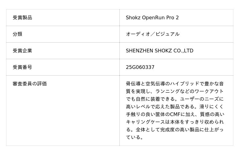 フォーカルポイント株式会社(本社:東京都港区、代表取締役社長:恩田英樹、以下フォーカルポイント)は、Shokz社の日本国内代理店として、Shokz OpenRun Pro 2が「2025年度グッドデザイン賞(主催:公益財団法人日本デザイン振興会)」を受賞したことをお知らせいたします。