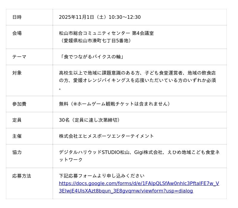 Gigi株式会社(代表取締役:今井了介、所在地:東京都港区)は、愛媛県を本拠地とするB.LEAGUEクラブ「愛媛オレンジバイキングス」(運営:株式会社エヒメスポーツエンターテイメント、本社:愛媛県松山市、代表取締役社長 北野 順哉)が実施する「食で繋がるバイクスの輪」をテーマとしたワークショップに協力メンバーとして、参画いたします。