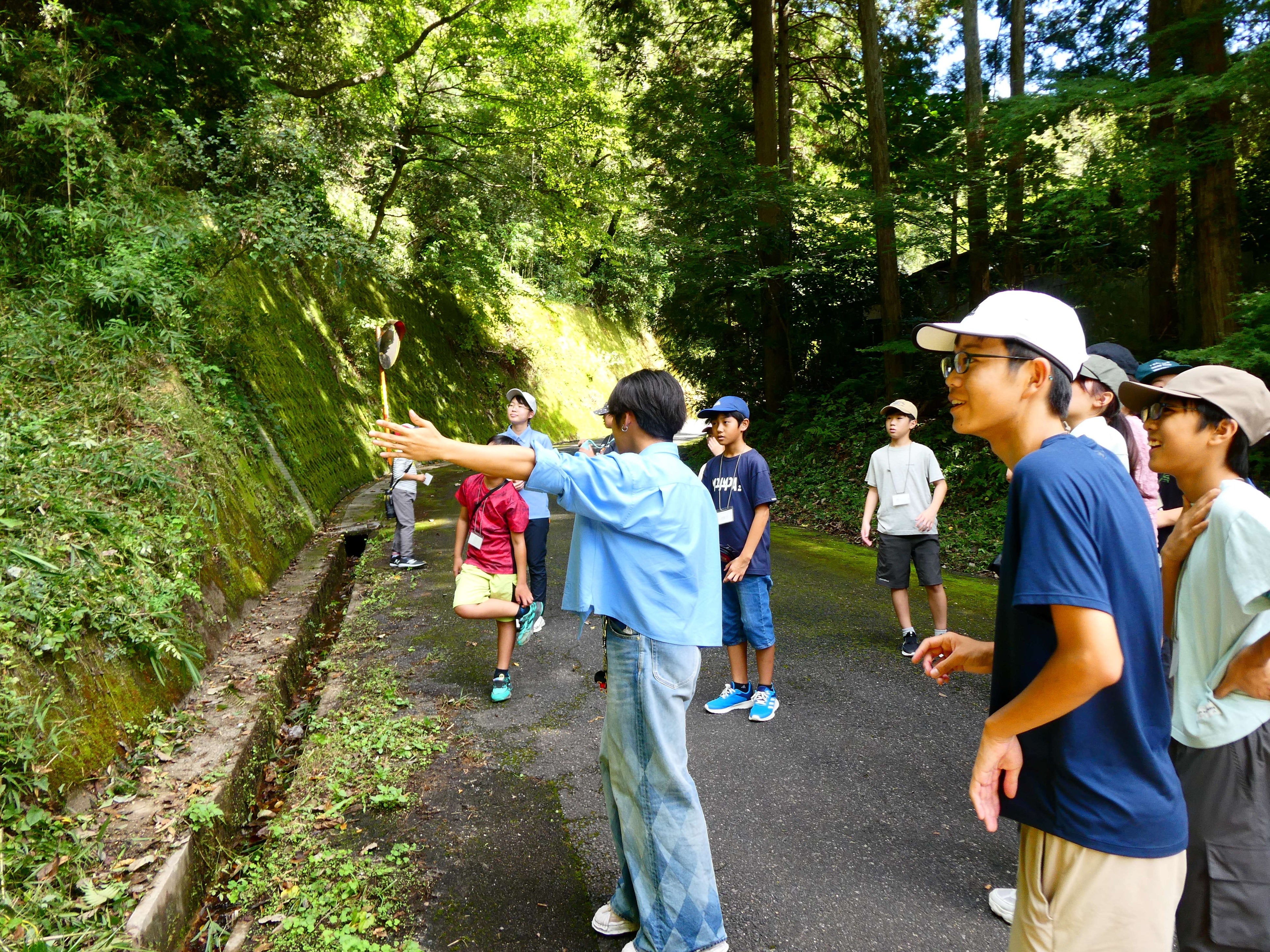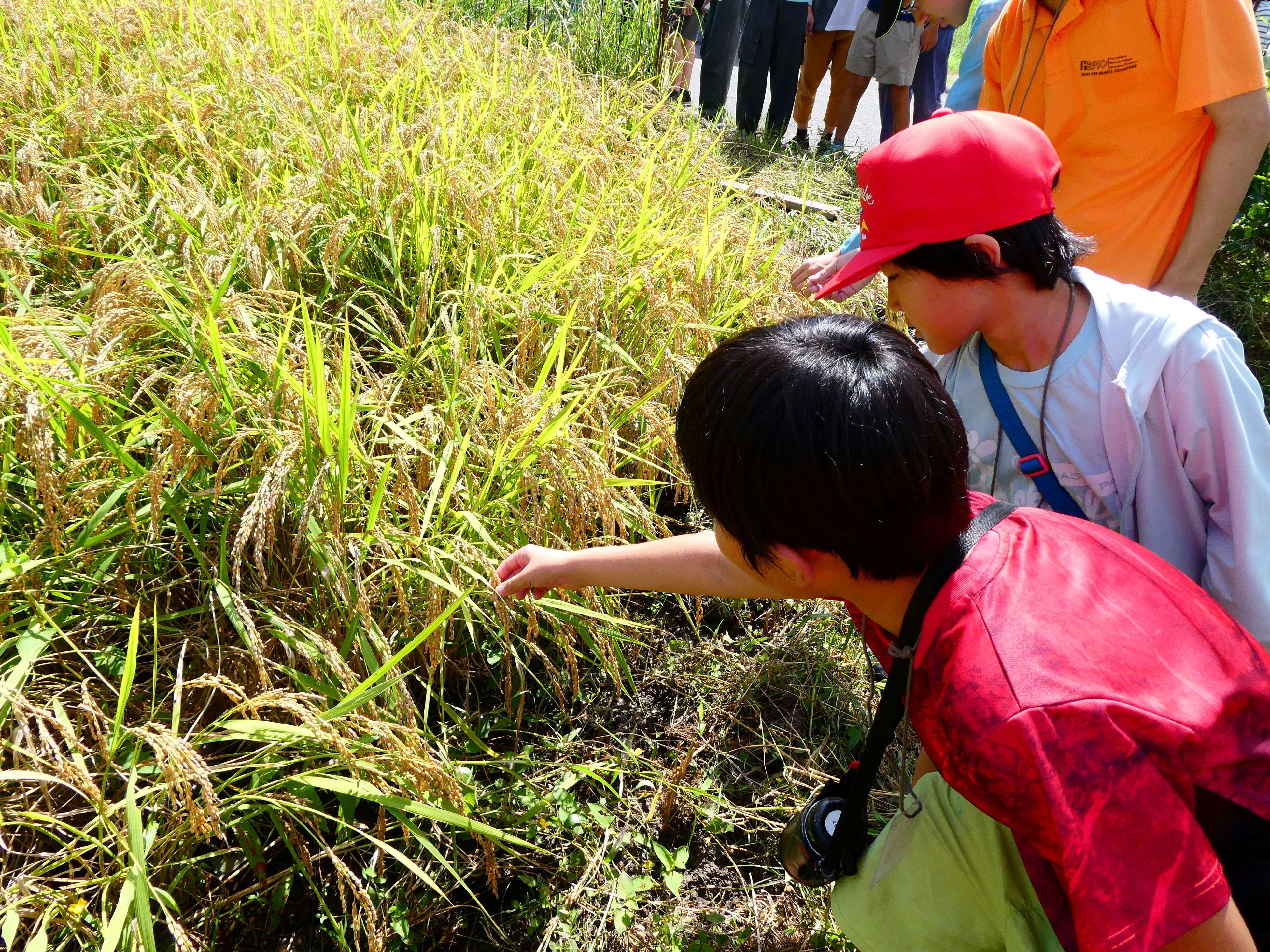 午後は、本来は5月に実施した豊田高専ドミタウンで田植えしたもち米の稲刈りを実施予定でした。しかし、前日夜の大雨により、田んぼのぬかるみが激しく、残念ながら稲刈りは断念せざるを得ませんでした。その代わりに、稲刈り予定の田んぼを含めて、笹戸町内の散策(まち歩き)を行いました。初めて笹戸町を訪れた小学生・高専生もおり、「同じ豊田市内でもこんなに自然の多さが違うのか!」と驚いている様子も見られました。