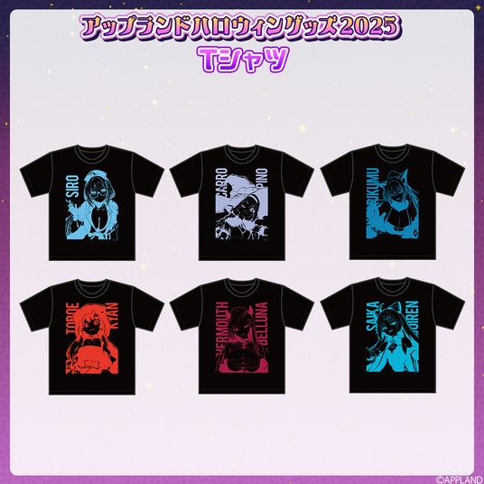 「.LIVE」より電脳少女シロ、カルロ・ピノ、リクム、「ぶいぱい」より遠吠きゃん、ベルモット・ベルーナ、彩歌すいれんの描き下ろしイラストを使用した『アップランドハロウィングッズ2025』を当社が運営する公式グッズ販売サイト(APPLAND OFFICIAL SHOP)にて2025年10月20日(月)より販売いたします。ハロウィンの妖艶な雰囲気をまとった特別なイラストグッズをご堪能ください。