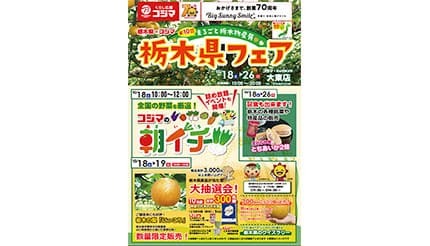 コジマは10月18~26日の期間、栃木県の名産品をとりそろえて販売する「第10回 まるごと栃木物産展」を、コジマ×ビックカメラ大東店(大阪府大東市)にて開催する。