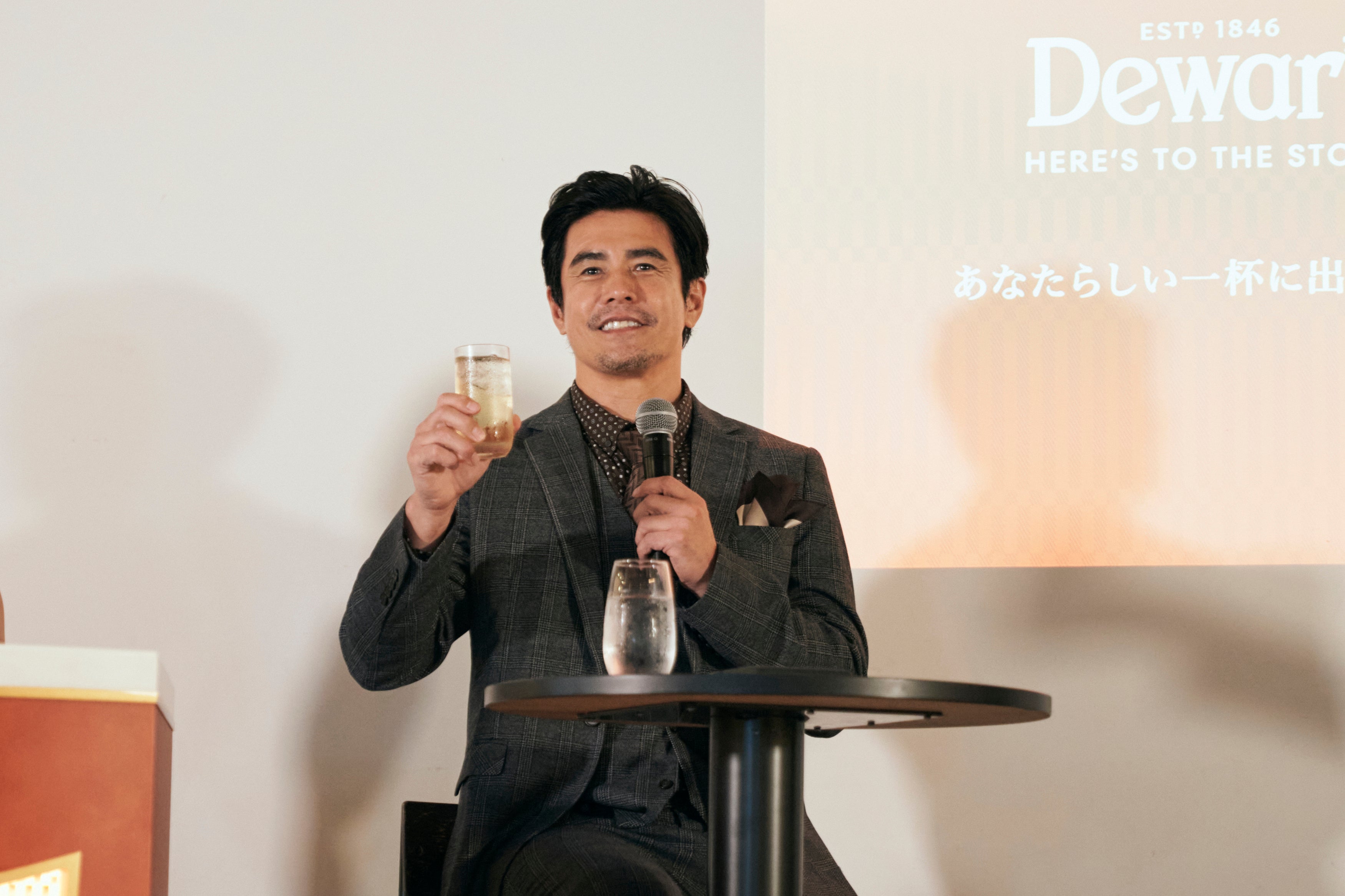 続いて、ステファニー氏の呼び込みで、俳優の伊藤英明さんがステージに登場。伊藤さんによる、スコットランド・ゲール語で乾杯を意味する「Slainte!」の発声のもと、デュワーズ 12年ハイボールを楽しみながらトークセッションはスタートしました。