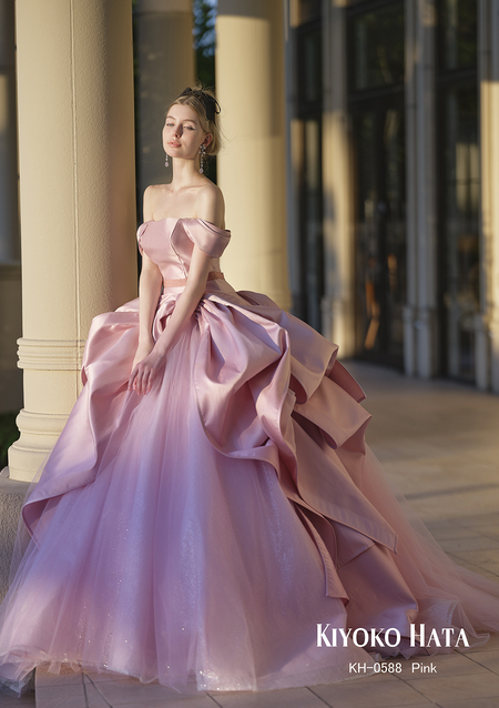 やわらかなピンクが肌に溶け込むように馴染み、甘さの中にも気品が漂うロマンティックなカラードレス。