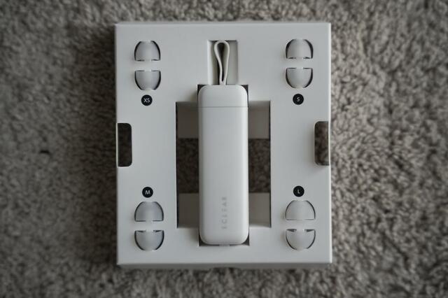箱を開けると、耳栓本体と収納ケースの他に、XS〜Lサイズの4種類のイヤーチップが入っています。