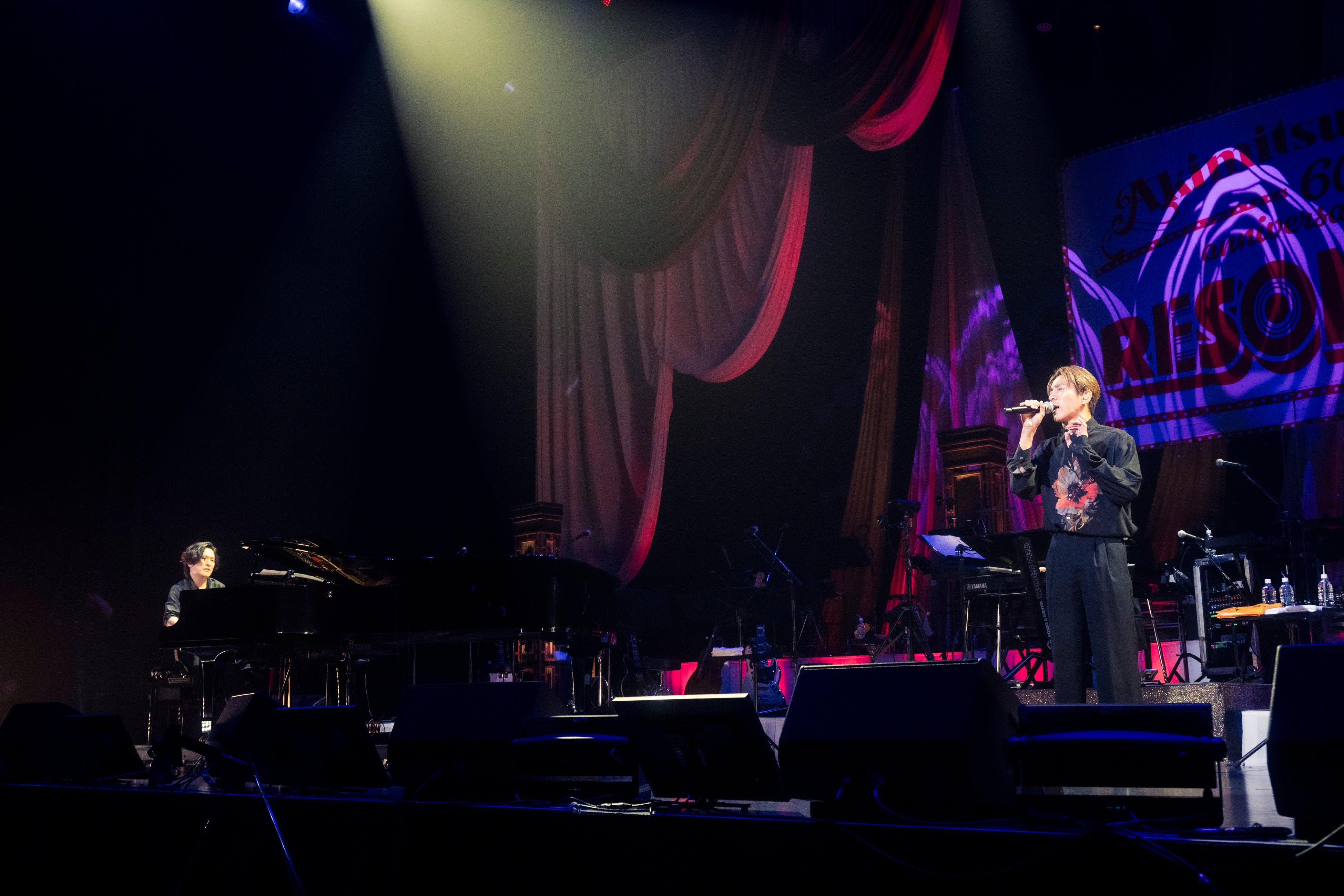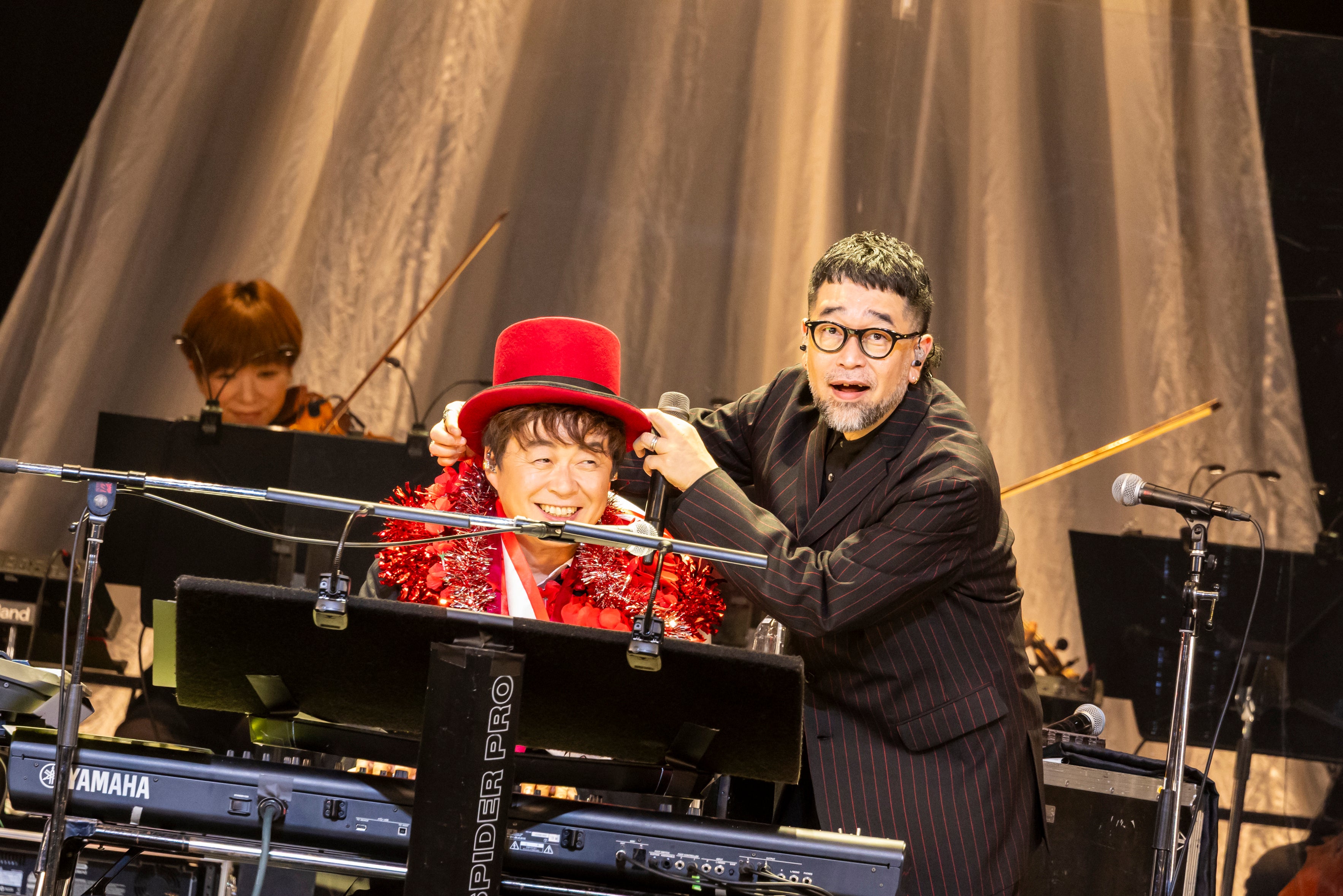 そして本間がこれまでアレンジを手掛けた作品を、アーティストがメドレーで披露するコーナーがスタート。渡辺美里は、30周年記念第一弾シングルとして大江千里が書き下ろした「ここから」(編曲:本間昭光)を披露。<未来はここにある ここからまた始めよう>と本間にメッセージを贈った。広瀬香美「promise」は亀梨和也と岡野昭仁(ポルノグラフィティ)という異なる色気を感じるボーカリストの共演に客席が沸き立ち、カズン「冬のファンタジー」は藤井隆とコーラスの会原実希が美しいハモりで魅了する。松本隆×筒美京平のゴールデンコンビの手による名曲、中川翔子「綺麗ア・ラ・モード」は、いきものがかりがカバー。80年代の薫りを感じるこの曲を吉岡が丁寧に歌い、届ける。そしてV6「Darling」はこの日は槇原敬之がカバー。人懐っこいメロディがさらに親近感を湛えて伝わってくる。