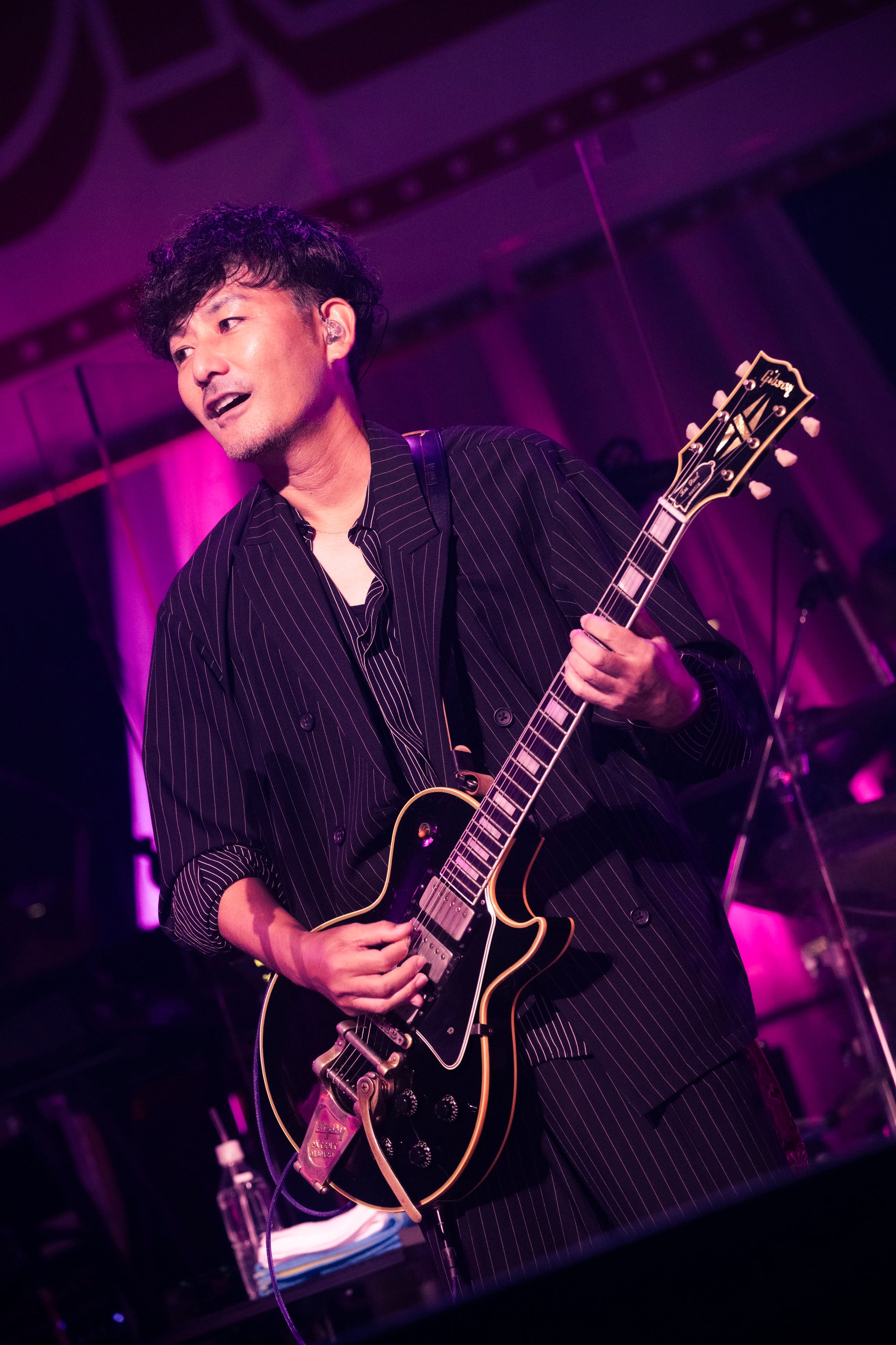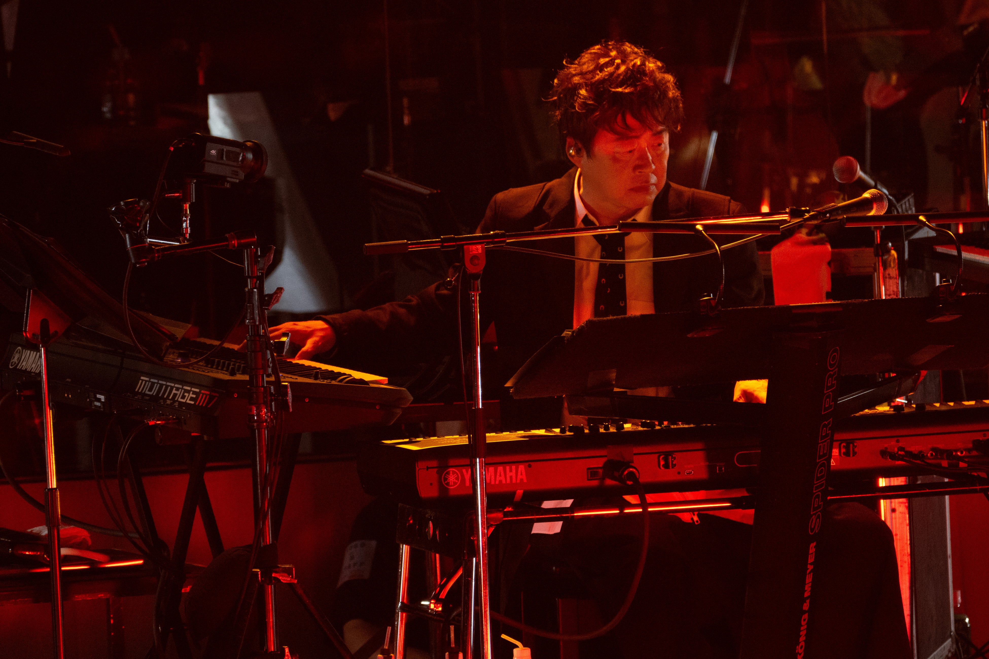 そしてポルノグラフィティだ。初日に続いて岡野昭仁が客席から登場して沸かせる。本間と作り上げた初期の作品のメドレーには初日同様歓声が起こり、様々な音楽を共に作り上げてきたことがわかる。2日目は「アゲハ蝶」(2001年)が日替わり曲としてセットリストに追加された。パーカッシブなラテンフレーバーのサウンドと圧巻の歌は進化している。「ラララ」の大合唱は美しく、岡野の歌と重なり感動が生まれる。「ミュージック・アワー」も日替わりで演奏され、全員でポルノのライヴではおなじみの“変な踊り”で盛り上がる。初めてポルノのライヴを観た人は、岡野の圧倒的な滑舌の良さに驚いた人も多いのではないだろうか。言葉が一語一句全部きれいに聴こえ、届いてくる。ポルノグラフィティの音楽の真骨頂だ。前日に続いて「ハネウマライダー」はライヴのクライマックスのような熱量で、ポルノグラフィティがTHEライヴバンドであるということが再確認できた。10年ぶりの披露となった「最後のステージ」。<命>という歌詞をリフレインするところは、まるで命をしぼり出すかのような岡野の気迫のこもった歌声が印象的だった。