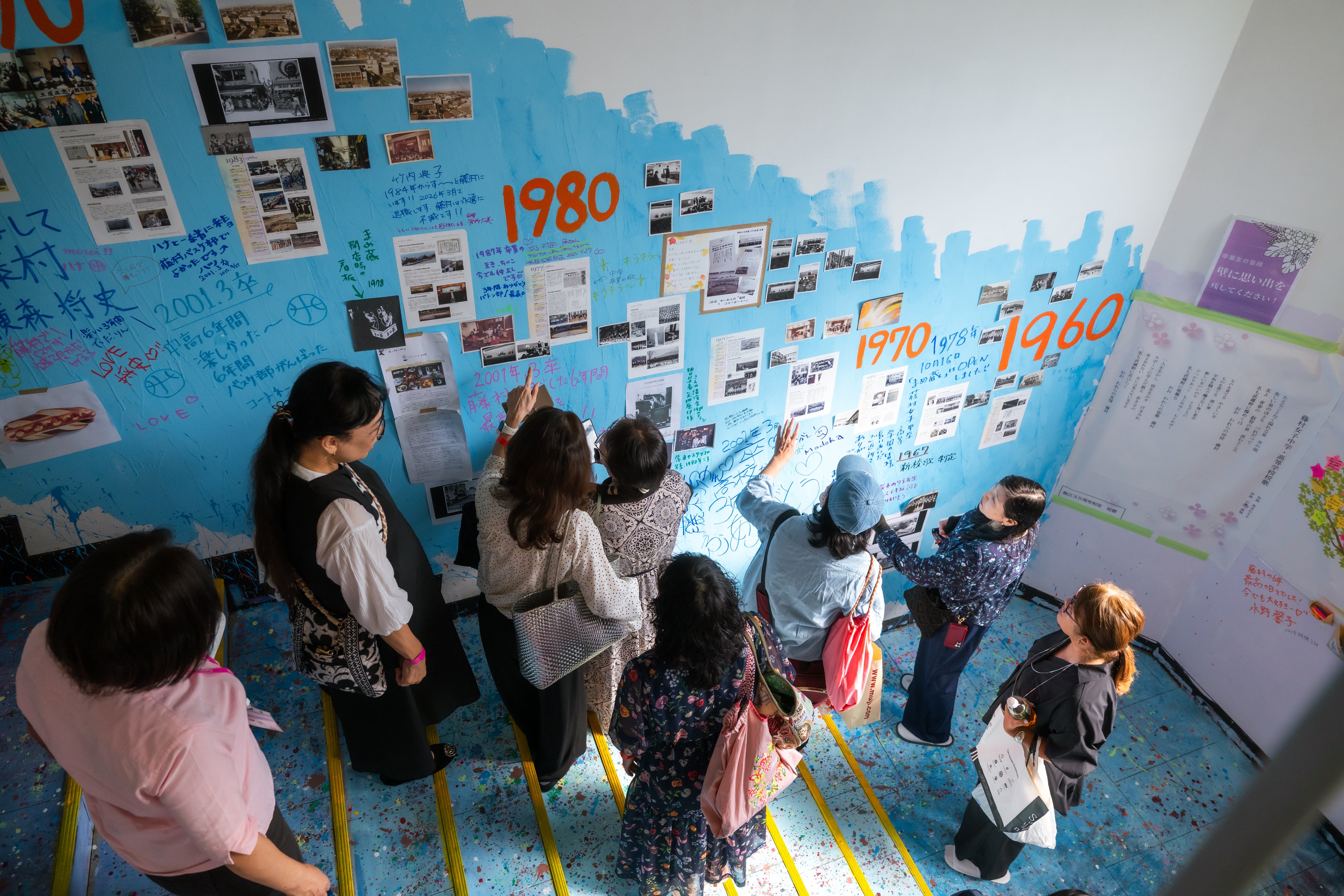 「ありがとう企画」は、藤村祭が初の一般公開となり、在校生・卒業生・地域の方々が参加し、現校舎への「ありがとう」をテーマにしたアート作品群を制作。校舎の壁や廊下を“巨大なキャンバス”として使用し、思い出と未来をつなぐ空間アートを完成させました。学校創立の1932年から現在に至るまでの「吉祥寺年表制作」では、地域のお店・企業から創業時の貴重な資料や想いのこもったイラストなどが描かれ、学校とまちが共に歩む象徴的な取り組みとなりました。