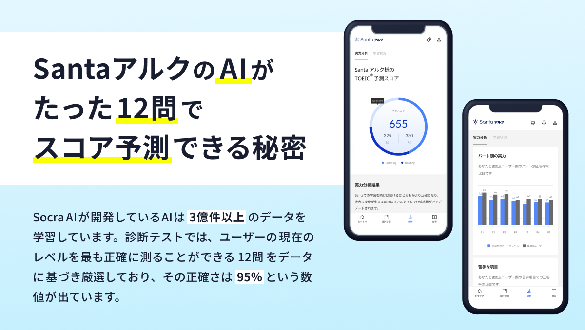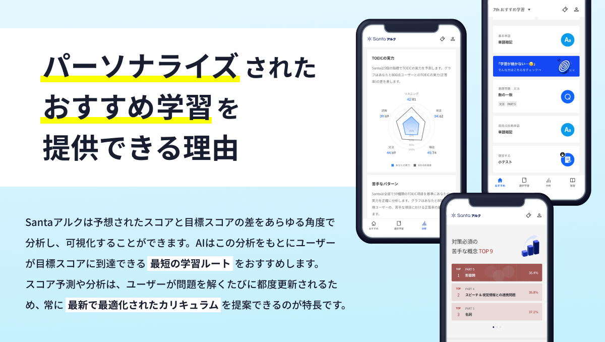 Santaアルクは、3億件以上の解答データを学習したAI搭載のTOEIC(R)対策アプリです。