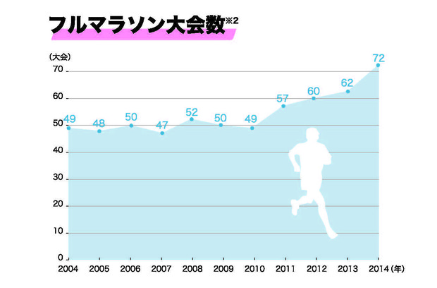・フルマラソン大会数:2004年49大会→2014年72大会(23大会増)