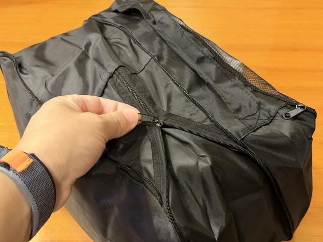 衣類をすべて入れ終えたら、上部のファスナーをしっかり閉じて、あとは側面の圧縮用ファスナーをぐるっと回して閉じるだけ。