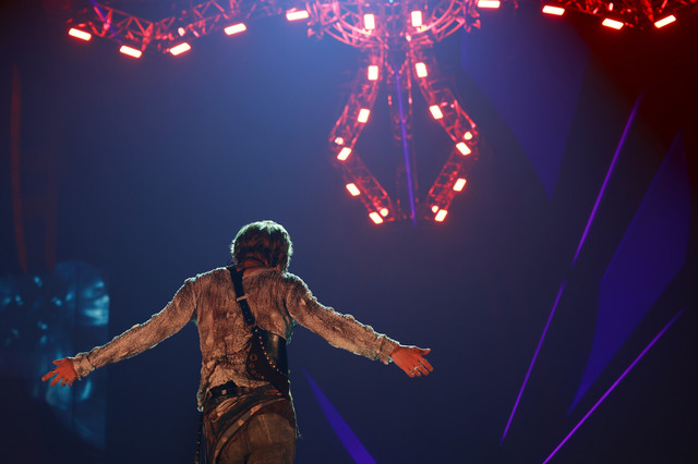 歌でも低くささやくような歌い方から、高く透き通るような歌声まで、多彩な歌声を聴かせる。演出も細部までこだわりが尽くされており、檻の中に入って囚われの身のような場面を作ったり、スポットライトの下でまるで天に召される瞬間のような神々しさを感じさせたり、スモークの中でひざまつき神に願いを乞うような切実さを見せたり――1曲1曲の世界観を見せつつテーマを底通させる。
