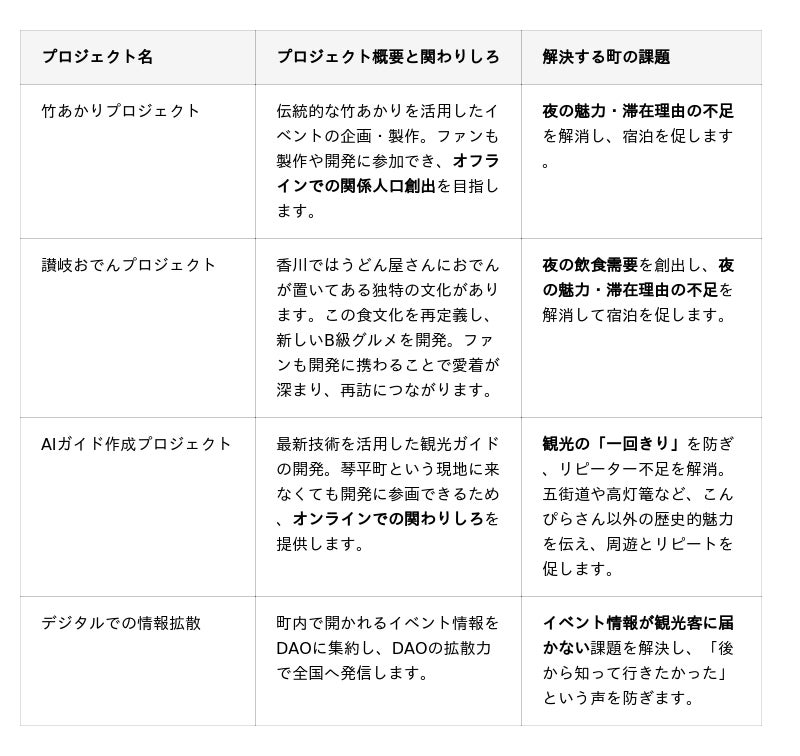 琴平町DAOでは、すでに以下のようなプロジェクトが動き始めています