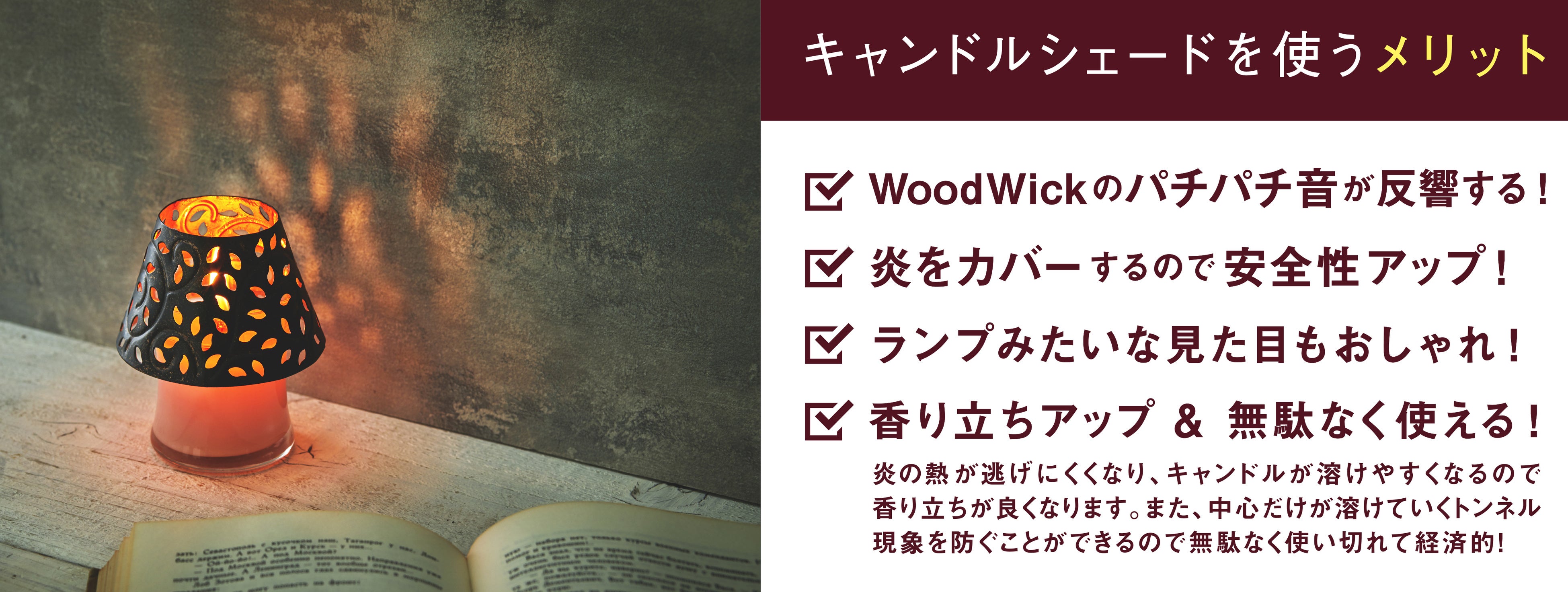 「WoodWickジャーS用シェード」は「WoodWickジャーS」に被せることにより、木製芯の燃えるパチパチ音がシェードの中で反響するので、よりWoodWick特有の暖炉のような音をお楽しみいただけます。また、炎をカバーするので安全性が上がり、見た目の印象が変わるのはもちろん、熱が逃げにくくなるためキャンドルが無駄なく溶けて、香り立ちがアップしたりと様々なメリットがあります。