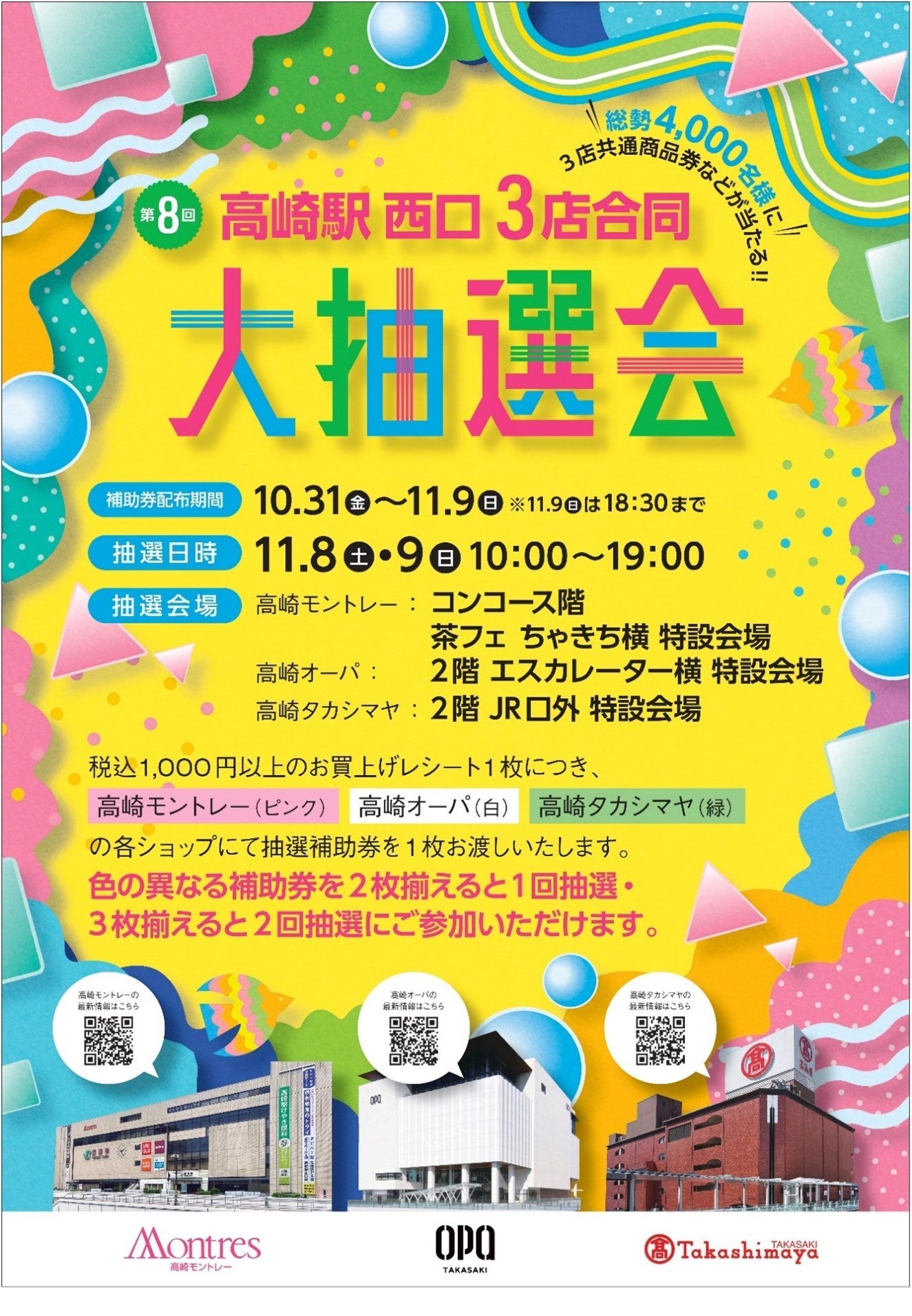 高崎駅西口の3店(高崎モントレー/高崎オーパ/高崎高島屋)共通商品券10,000円分など、豪華景品が当たる抽選会。税込1,000円以上の購入で補助券を配布。補助券2枚で1回、3枚で2回抽選会に参加可能。