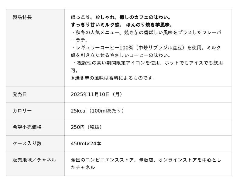 さらに期間限定で、生クリーム専門店「Milk」のコラボ第2弾『ミルク好きの北海道産生クリーム入りカフェラテPET450ml』を10月20日(月)に、『ミルク好きの焼き芋ラテ PET450ml』を11月10日(月)に発売します。