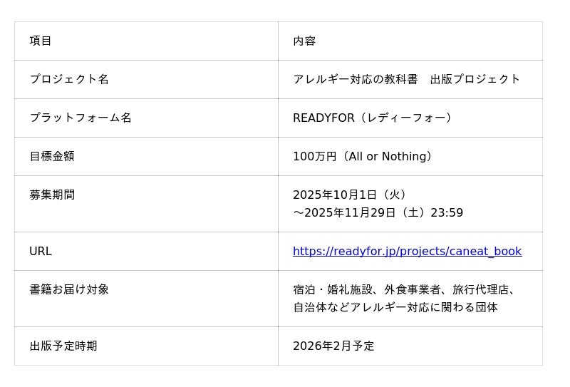 本プロジェクトでは、支援金を活用してアレルギー対応に取り組む事業者や自治体へ書籍を届け、現場の意欲と理解を高めることで、誰もが安心して食事を楽しめる社会の実現を目指します。