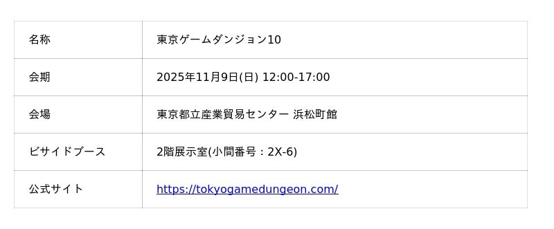 2025年11月9日(日)に東京都立産業貿易センター 浜松町館にて開催される「東京ゲームダンジョン10」にビサイドが出展いたします!