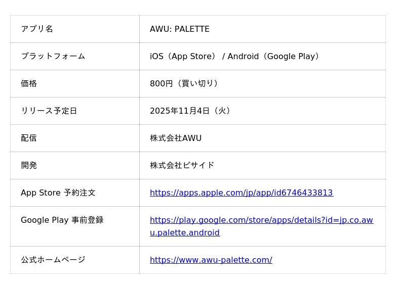 株式会社アドウェイズ(本社:東京都新宿区、代表取締役社長:山田 翔、以下アドウェイズ)の連結子会社である株式会社AWU(本社:東京都新宿区、代表取締役社長:西岡 明彦、以下AWU)は、仕事効率化とヘルスケアをサポートするアプリ「AWU: PALETTE」を、2025年11月4日(火)にリリースし、予約注文・事前登録を開始いたします。