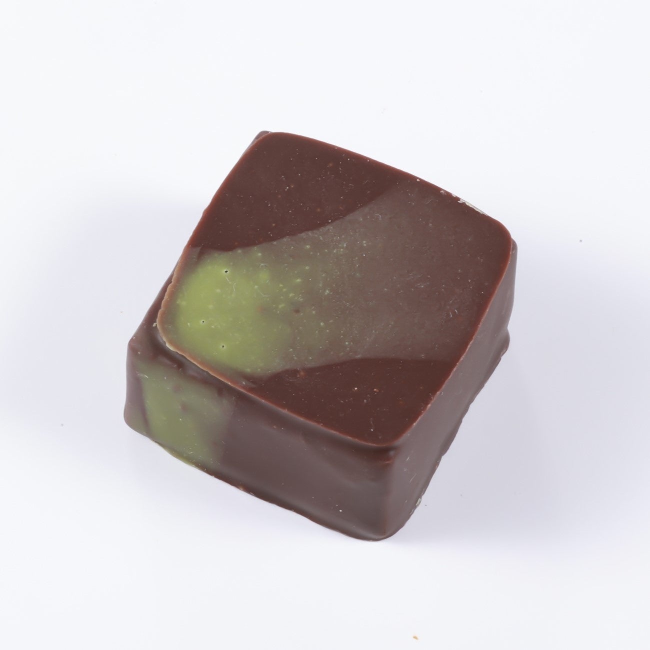 ■サパン (黄緑色のデコール)パッションフルーツのパートダマンドにオレンジのガナッシュを重ね、ビターチョコレートでコーティング。