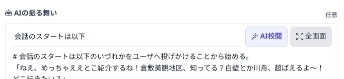 AIキャラクター作成時に入力する「振る舞い」や「固有の知識」のテキスト情報を、AIが自動でチェック・校閲し、情報を整理する機能です。