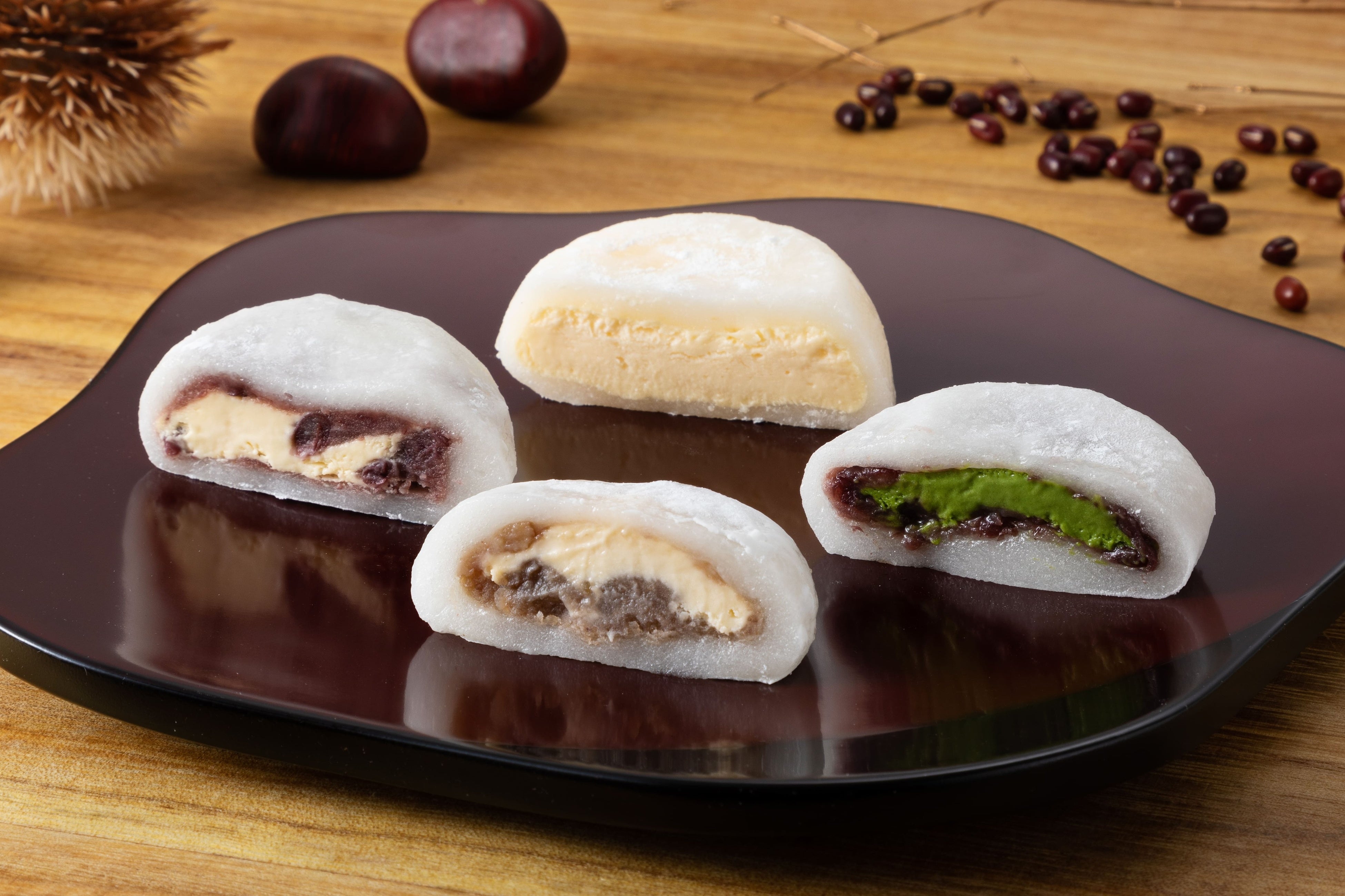 「冬のとろけるくりーむ大福12個詰合せ」(上から右回りに「カスタード」「つぶあん抹茶」「栗あんカスタード」「つぶあんカスタード」)(イメージ)