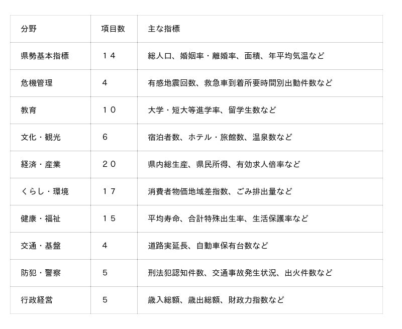 「統計ハンドブック」は、県民生活に深く関わりがある「100の指標」を選定し、全国における静岡県の順位をわかりやすくまとめています。