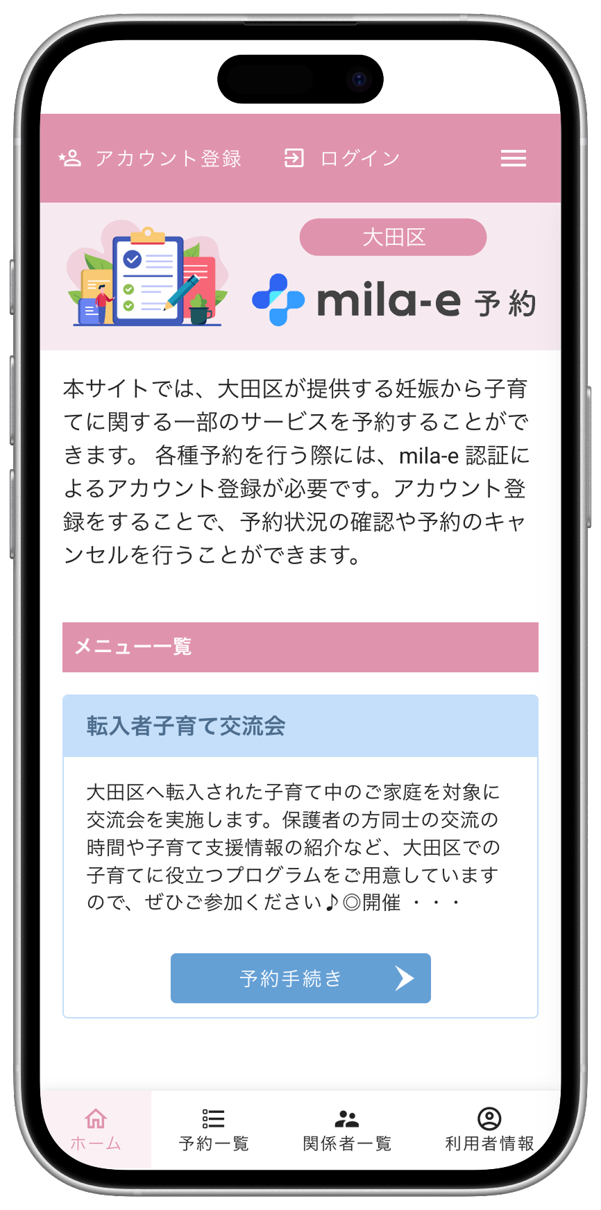 mila-e おやこ手帳 TOP画面の「各種予約」からアクセス後、お持ちのmila-e 認証アカウントにてログイン、利用者情報を入力し予約を行ってください。