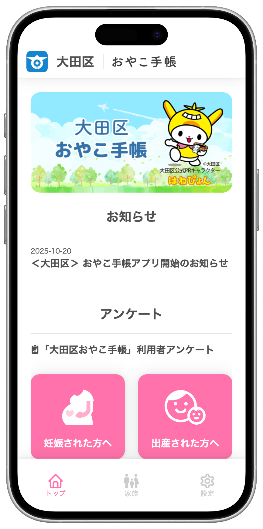 詳細は、以下大田区 おやこ手帳(母子保健・子育て支援アプリ)のご案内ページをご覧ください。