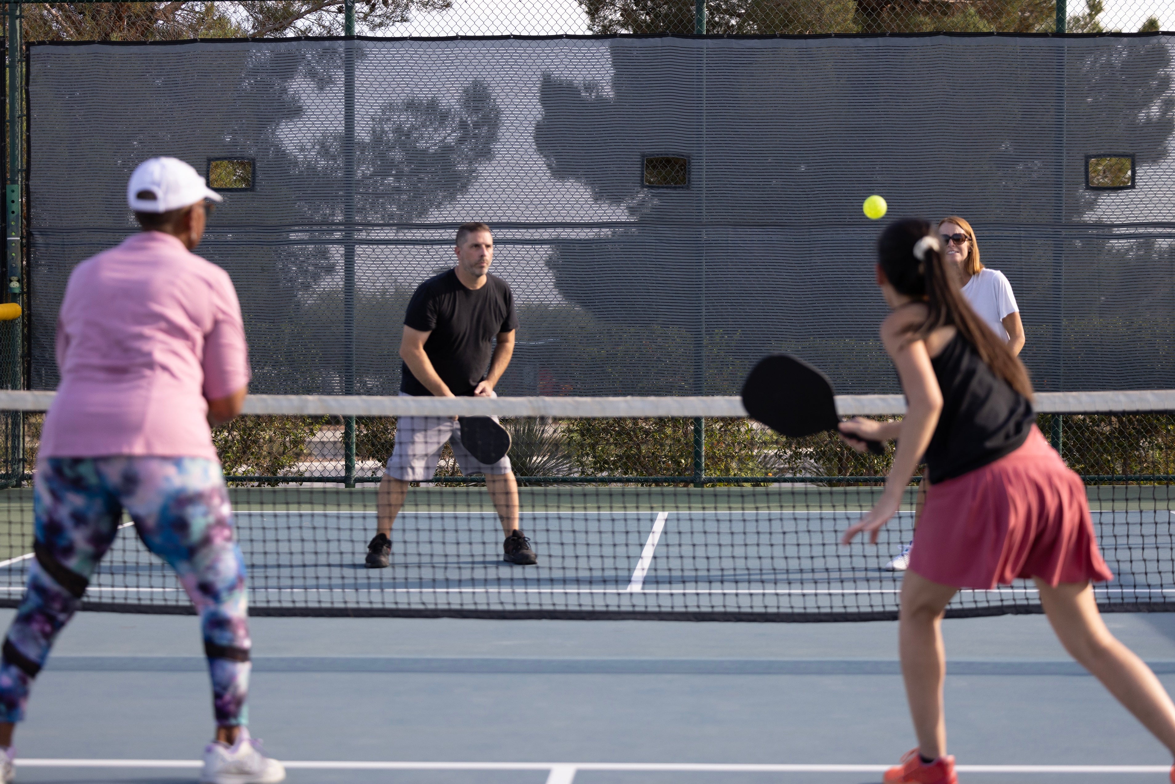 ピックルボールはアメリカ発祥の急成長中のニュースポーツです。テニスコートの約3分の1、バドミントンと同じ大きさのコートで、専用の「パドル」と呼ばれるラケットを使用し、プラスチック製の穴あきボールを打ち合います。ボールに穴が開いていることでスピードが抑えられ、初心者でもラリーが続けやすいのが特長です。