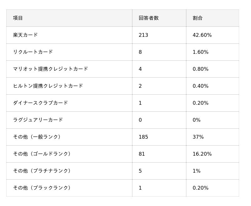 - ホテル代の支払いで最もよく利用されているクレジットカードは「楽天カード」で、全体の約43%を占める。