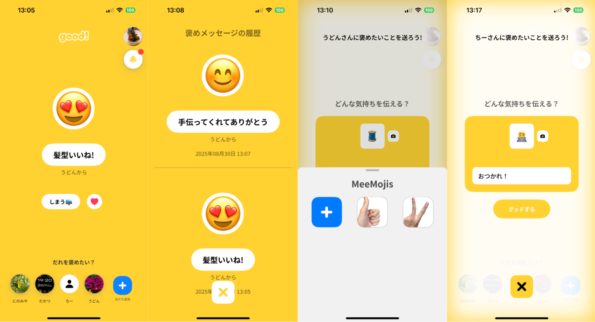 「good!」は、友だちや好きな人に「褒めたい」「ありがとう」という気持ちを伝えるためのアプリです。直接言葉にするのが恥ずかしいときでも、絵文字と簡単な一言で気軽に気持ちを届けられます。
