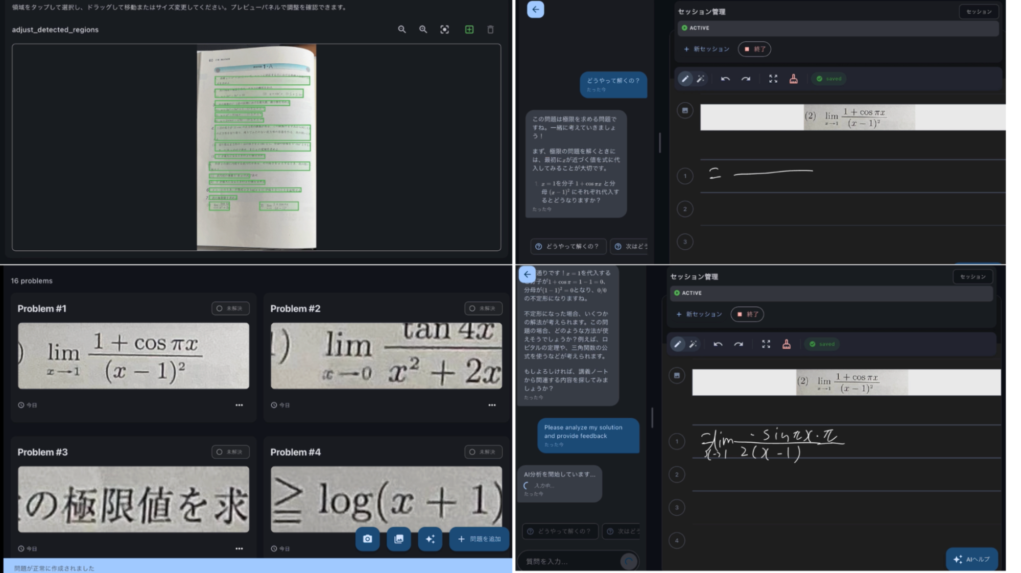 タブレット向けの数学学習アシスタントAIアプリです。問題集を撮影して取り込み、スタイラスペンで解答しながらAIに質問や採点を依頼できます。AIが苦手を分析し、自動で復習問題やアドバイスを生成。一人では解きづらい数学の問題も、AIと一緒に学ぶことで自力で解けるようになることを目指します。
