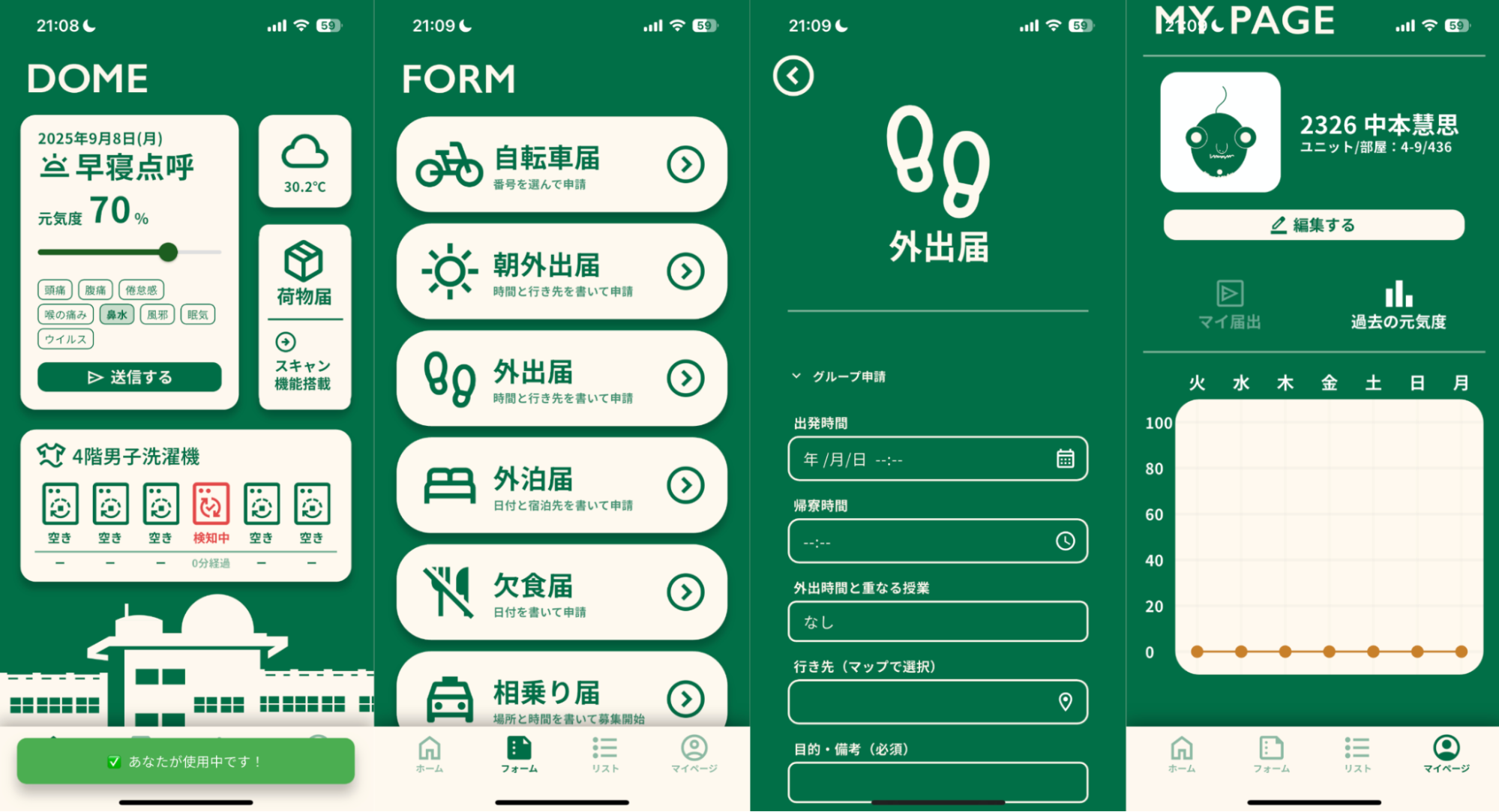 学校の寮生活を効率化するDXアプリ「DOME」は、点呼や外出・外泊届といった煩雑な手続きをデジタル化します。学生はスマホから簡単に申請ができ、寮運営スタッフもデータベースを活用して業務を大幅に効率化できます。これにより、学生・スタッフ・保護者それぞれの負担を減らし、よりスムーズな寮運営を実現します。