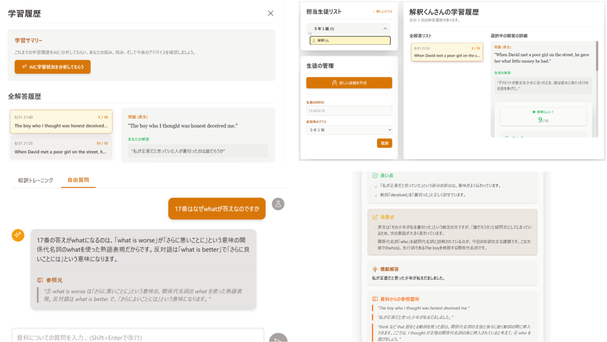 手持ちの教科書・参考書を写真に撮るだけで、AIが和訳問題を出題し、プロの家庭教師のように添削・解説してくれる対話型英語学習アプリです。生徒はいつでも個別フィードバックを受けられ、教員は課題の作成・管理業務を効率化し、生徒一人ひとりの学習状況をデータで把握できます。教育現場と生徒双方の課題を解決し、新しい英語学習の形を提供します。